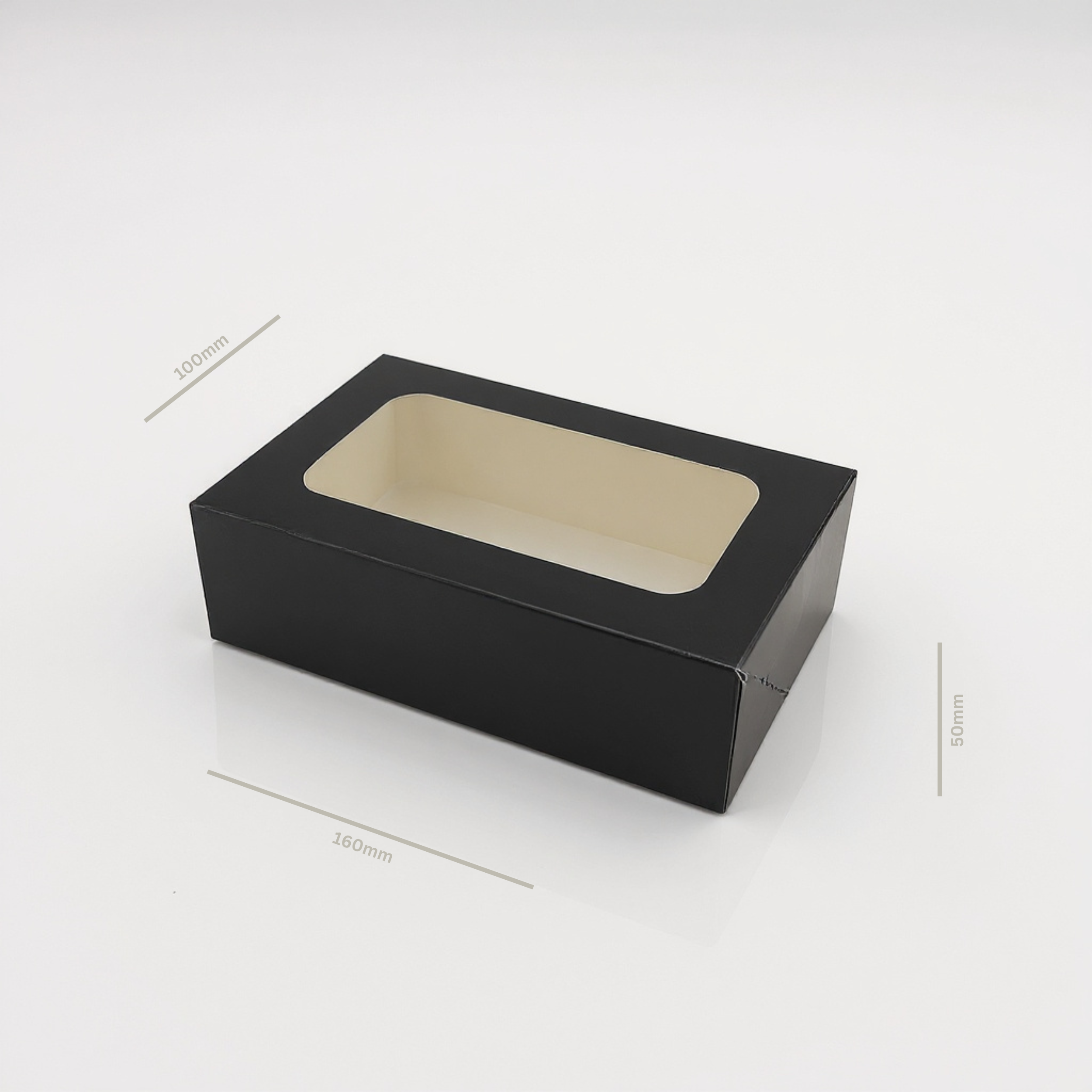Rechteckige Kartonbox 800 ml schwarz mit PET-Sichtfenster – 160 x 100 x 50 mm, 170 Stk.